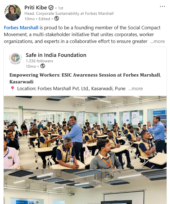 As an initiative to address this gap, the Safe in India Foundation (SII) was delighted to partner with Forbes Marshall, leveraging their ambitious and effective Parivartan initiative - to conduct systematic ESIC awareness sessions across their supply chain units over the past two years.